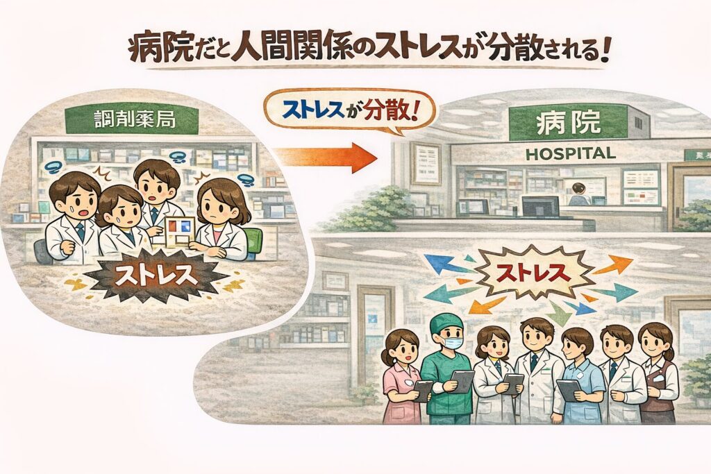 調剤薬局だと数人規模の職場で人間関係のストレスが凝縮される印象がありますが、病院の場合だと他部署を含めるとかなりの人数の人と関わりながら仕事をします。