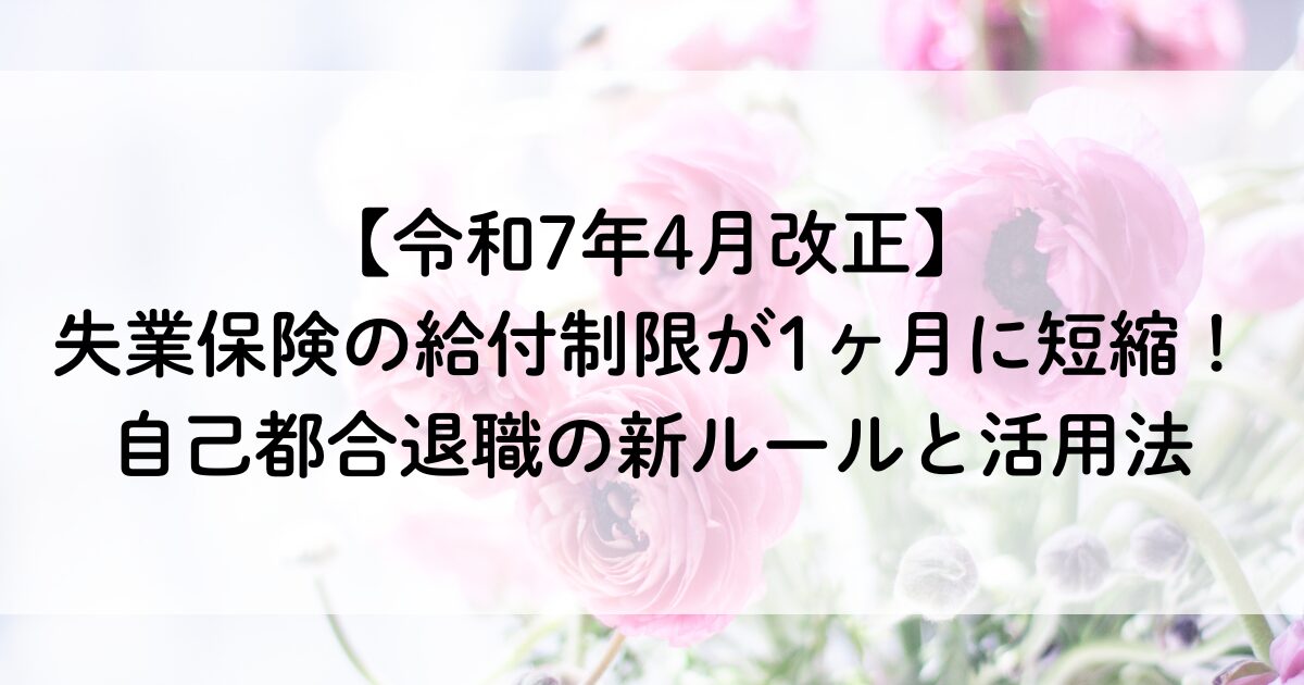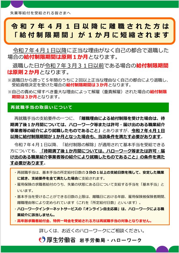 実は、令和7年(2025年)4月1日から制度が改正され、自己都合退職者の給付制限期間が原則2ヶ月→1ヶ月に短縮されました。