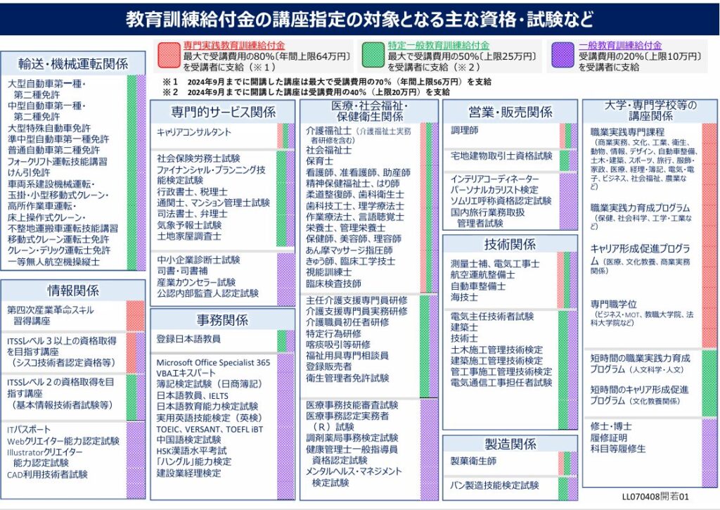 厚生労働省の教育訓練給付金のページ(https://www.mhlw.go.jp/stf/seisakunitsuite/bunya/koyou_roudou/jinzaikaihatsu/kyouiku.html)から引用した図ですが、対象となる資格だけでもこれだけたくさんあります。