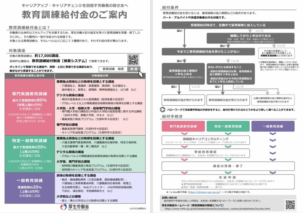 講座の詳細については、厚生労働省指定教育訓練講座の検索システム(https://www.kyufu.mhlw.go.jp/kensaku/?utm_source=chatgpt.com)があるのでそちらで確認してください。