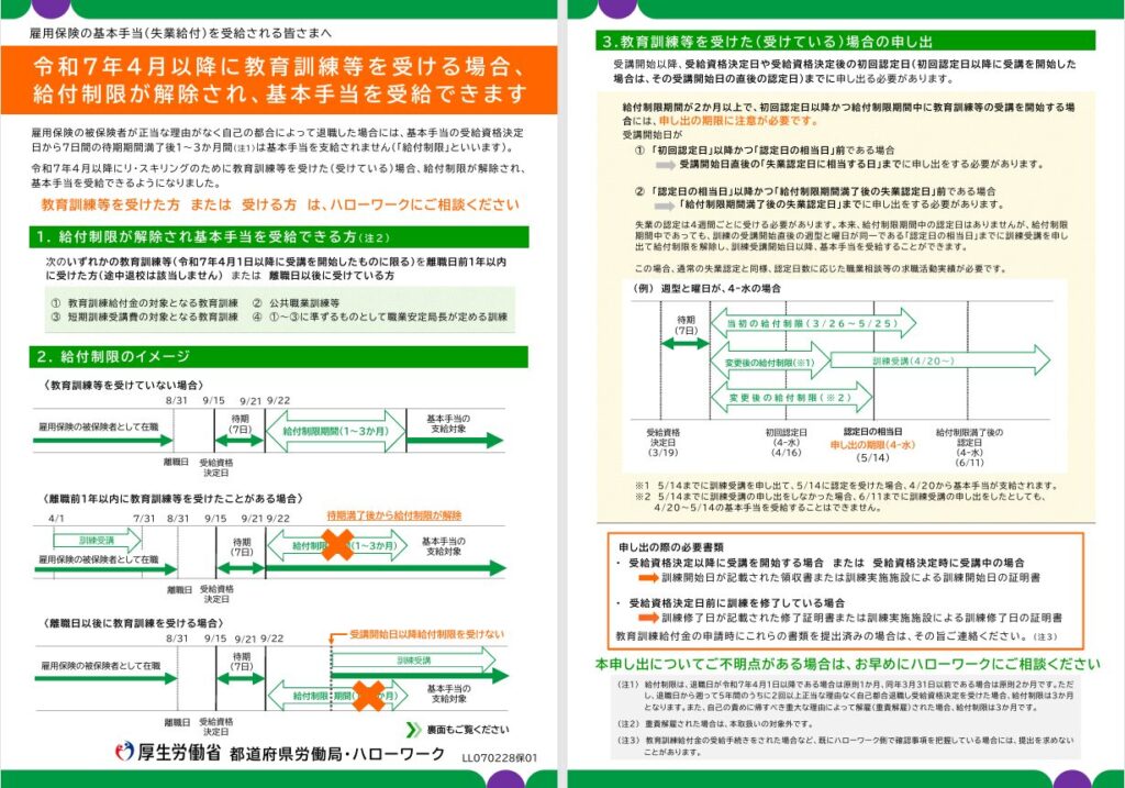 令和7年4月の改正により、自己都合退職者が厚生労働省指定の教育訓練を受講する場合、給付制限なしで失業保険を受給できるようになりました。